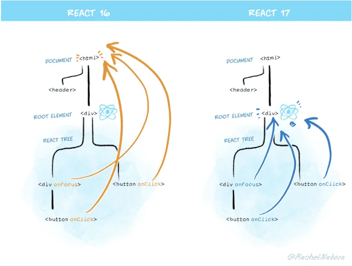 이벤트 위임이 document에서 리액트 컴포넌트 최상단 트리, 루트요소로 바뀌었다.