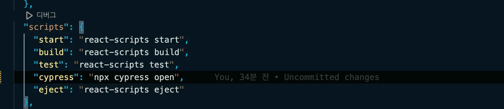 npm install cypress --save-dev설치 후 pakage.json 의 실행 명령어에 아래와 같이 cypress를 추가해준다.
